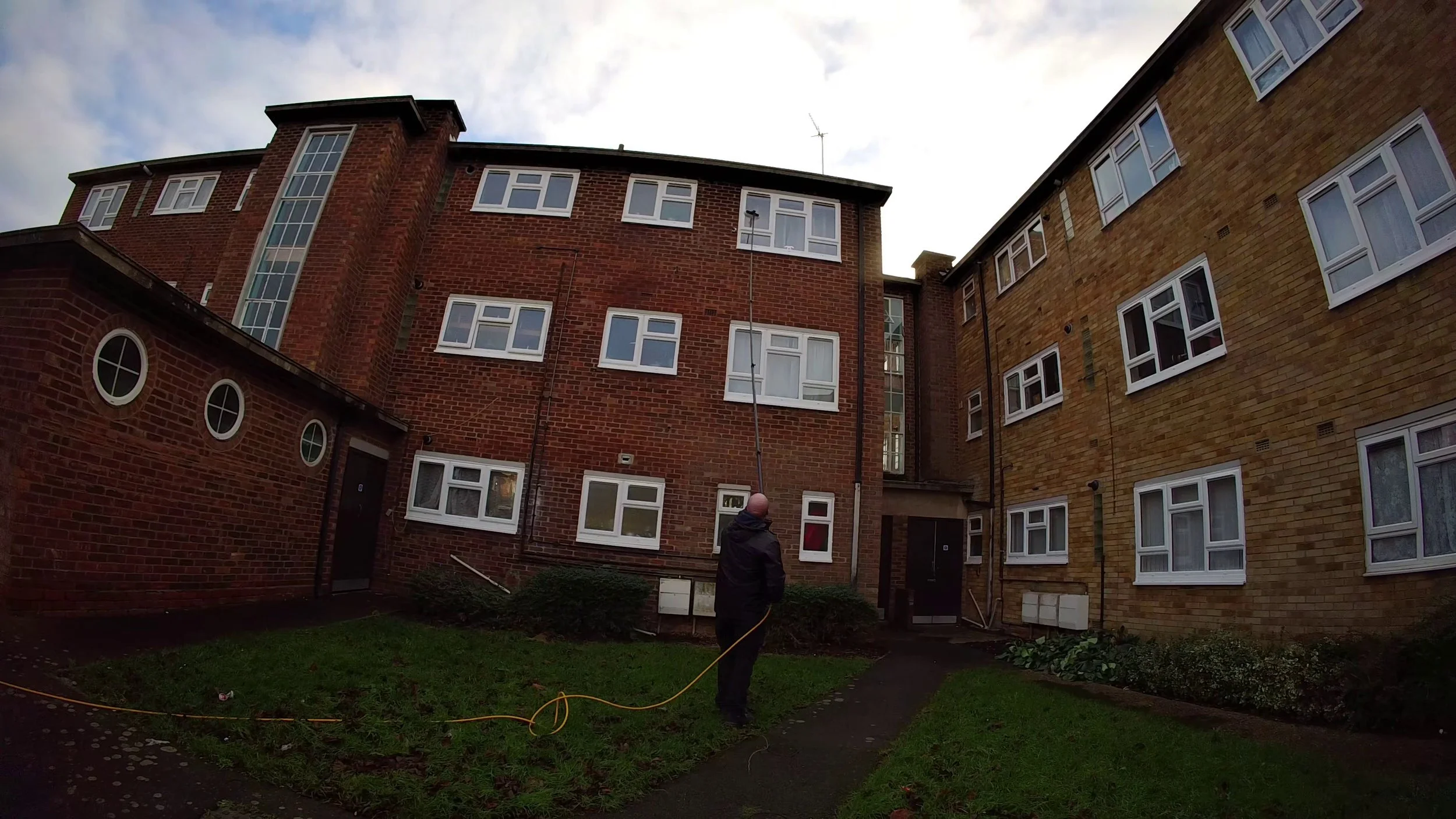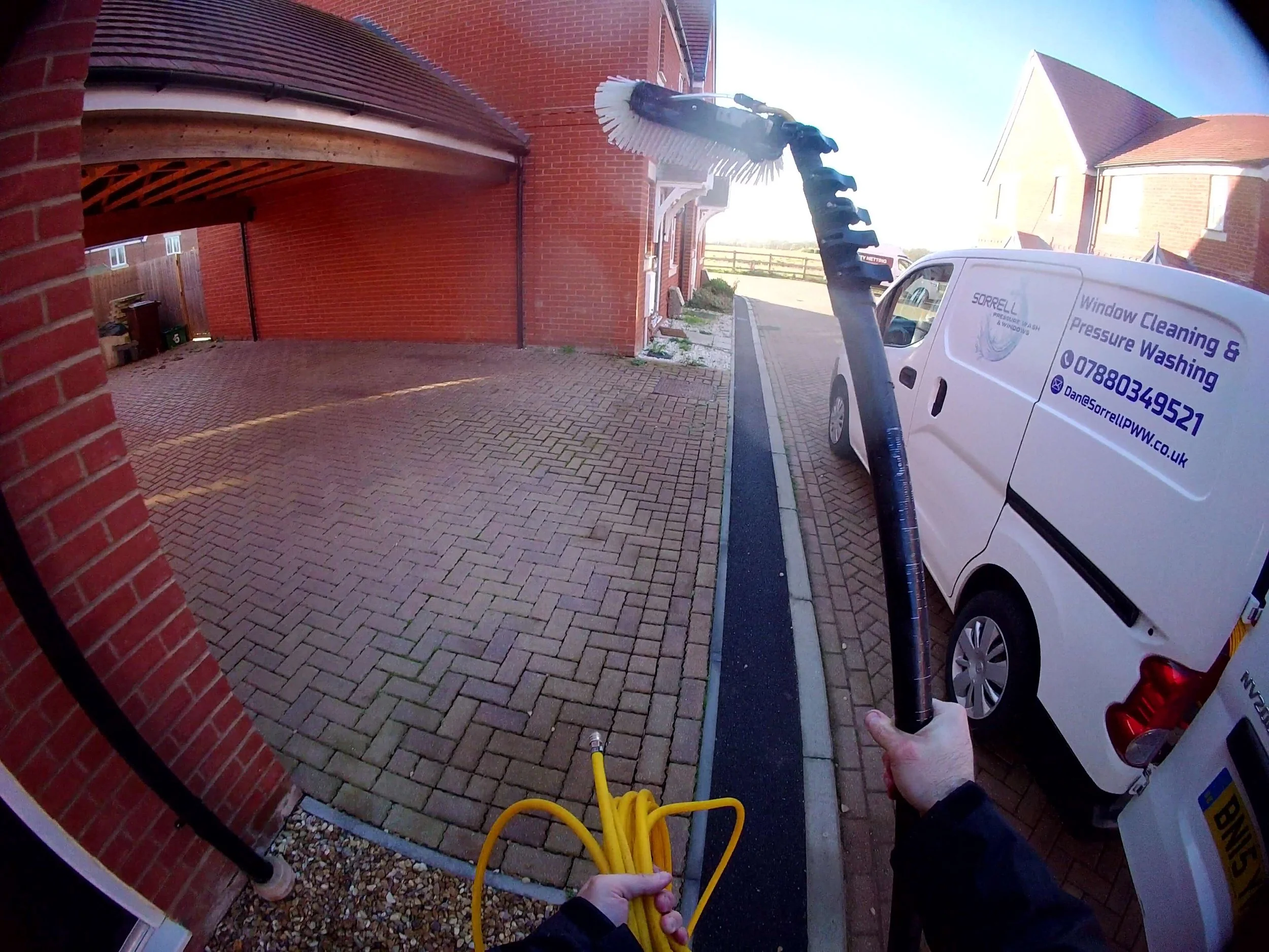 A bird's-eye view! Our carbon-fibre poles allow us to reach 3rd-storey windows and awkward angles safely from the ground