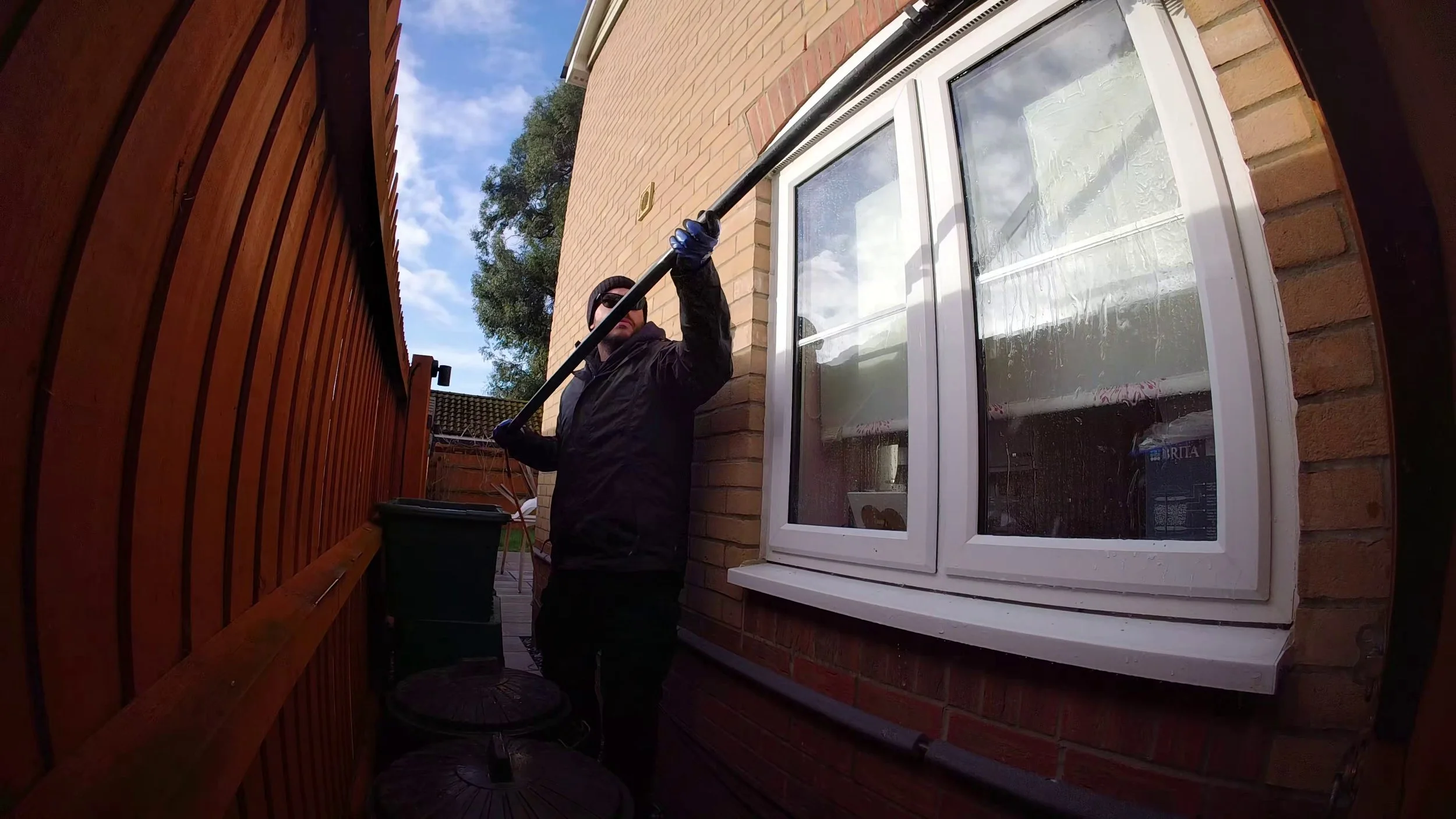 Taking on a narrow side-access window cleaning job near Layer Road, Colchester. This photo shows exactly why we use specialized equipment—our water-fed poles are fitted with multi-angle swivel brush heads. This allows us to clean windows at almost impossible angles where space is tight, ensuring every pane gets a thorough scrub even in the most awkward spots. No matter how narrow the side-path or how difficult the angle, we have the tools to reach it.